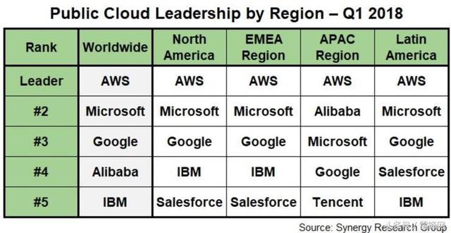 根據(jù)美國市場研究機構Synergy Research Group發(fā)布的2018年一季度全球主要地區(qū)公有云廠商IaaS和PaaS收入排名,前五的是AWS、微軟、谷歌、阿里云和IBM,亞太地區(qū)的前五為AWS、阿里云、微軟、谷歌、騰訊云。
