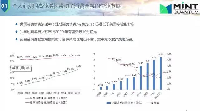 美國是個人消費實力很強的一個國家,我們以它為標桿。圖中藍線代表中國,紅線代表美國。預(yù)測中國短期個人貸款到2020年達10萬億元,可見市場龐大。個人消費不僅僅靠大銀行,還要靠其他小型機構(gòu);因為大銀行本身這種特點(客群優(yōu)質(zhì)),很難下放到下層服務(wù)。在信用風險中欺詐風險在我國占的比例非常高,數(shù)額也比較大,經(jīng)常是有組織的欺詐,如做“網(wǎng)絡(luò)黑產(chǎn)”有百萬級人員,市場規(guī)模為千億級,很多公司被迫無法經(jīng)營,據(jù)估計,互聯(lián)網(wǎng)金融一半以上的壞賬風險來自欺詐風險。對比美國這方面比例就相對小的很多,如一個千億級個人消費,中能達20-30億美元,美國則只有幾千萬美元。原因有一點是美國征信做的比較好,幾乎覆蓋所有成年人。反欺詐就是提高欺詐的成本。