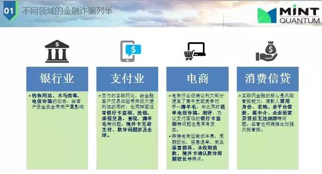 接下來介紹下不同領(lǐng)域的金融欺詐類型,如銀行業(yè)釣魚網(wǎng)站,木馬病毒,做一個假的網(wǎng)站;電商行業(yè)促銷讓利大部分便宜了黃牛黨或競爭對手—薅羊毛,與此同時退單電信詐騙,刷評,協(xié)議支付面臨的銀行卡盜刷等問題也是常有發(fā)生;消費信貸中借款人冒用身份、老賴、多平臺借款、黑中介、企業(yè)經(jīng)營異常貸后無法跟蹤等問題。