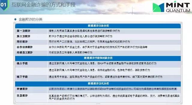 用技術(shù)去做反欺詐都是有針對性的,在進行反欺詐時需要知道欺詐的類型,下面是欺詐分類,有第一方欺詐,第三方欺詐等。第三方欺詐就是欺詐分子通過非法途徑獲取他人身份進行騙貸等欺詐行為;線下欺詐是通過信用卡偷盜,盜取其他用戶賬戶資金的行為或者通過偽造申請材料,線下面對面申請的欺詐行為;申請欺詐是以欺詐為目的,申請個人信貸賬戶以騙取銀行或P2P平臺等機構(gòu)資金的行為??杉毞譃樘摷偕矸萆暾埡吞摷儋Y料申請(這在反欺詐中很重要,將壞人擋于門外);交易欺詐對數(shù)據(jù)實時性比較高。欺詐風險是惡意的,自始至終就是不想還貸,信用風險更多的是一種還款意愿或還款能力導(dǎo)致無法還款。信用風險主要是看征信、數(shù)據(jù),建模型進行處理,計算欺詐概率,而欺詐是要分清黑白。