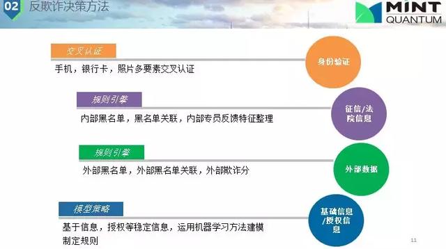 我們常用的一些反欺詐的數(shù)據(jù)和方法有:(1)身份驗證,這個是非常重要的,身份驗證在中國很偉大,如中國解決了第三方欺詐的問題。因為中國手機實名認證,有些時候你很難去做假,這樣我們可以交叉驗證,這樣就提高了欺詐的成本;(2)法院/征信信息,內(nèi)部黑名單,有公司會專門整理這些信息,可以公開給我們使用。用戶信息整合,通過各公司間信息碰撞,規(guī)則匹配,如果發(fā)現(xiàn)過去欺詐行為就不給他提供金融服務(wù);(3)模型,評估用戶行為,進行規(guī)則評判他這種行為是不是欺詐,如何減少錯殺準確抓住欺詐人員。