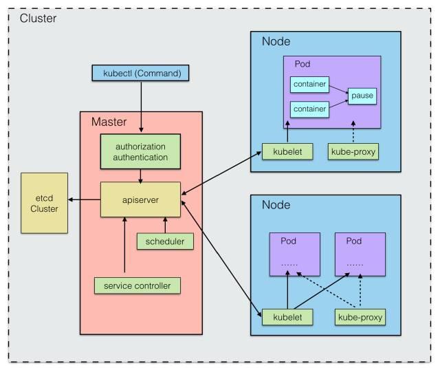 首先,Master 節(jié)點啟動時,會運行一個 kube-apiserver 進(jìn)程,它提供了集群管理的 API 接口,是集群內(nèi)各個功能模塊之間數(shù)據(jù)交互和通信的中心樞紐,并且它頁提供了完備的集群安全機制(后面還會講到)。