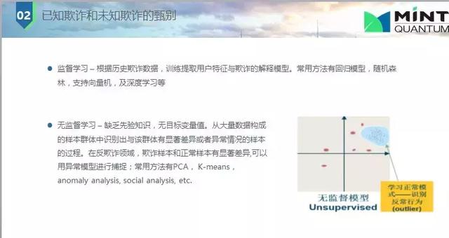 下面是欺詐與未知欺詐甄別問題,主要是監(jiān)督學(xué)習(xí)和非監(jiān)督學(xué)習(xí)。監(jiān)督學(xué)習(xí)是知道一個人以前欺詐(父母信息不對,電話號碼有誤等),我們就會打上標簽,歷史數(shù)據(jù)就會訓(xùn)練我們的模型,統(tǒng)計模型所用數(shù)據(jù)大都都是有標簽的;非監(jiān)督學(xué)習(xí)也是經(jīng)常使用的,因為欺詐是經(jīng)常改變的或不同特征的,我并不知道他是否是欺詐,我們用關(guān)聯(lián)網(wǎng)絡(luò),每個人間有聯(lián)系,這種網(wǎng)絡(luò)快速發(fā)展;還有一種是兩者結(jié)合起來,利用權(quán)重評估。