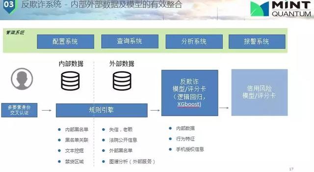 接下來講一下我們線上的一個反欺詐系統(tǒng)框架,下圖簡化了實際反欺詐系統(tǒng)。介紹了基本流程,首先是身份的交叉驗證,證明你是你。不光是銀行卡、手機、身份證交叉認證,還有你的照片、活體認證(你在上面動來動去);內(nèi)部數(shù)據(jù)和外部數(shù)據(jù)有一個決策引擎,這里面存儲了各種規(guī)則;接下就是一個評分分析系統(tǒng),這些數(shù)據(jù)有手機的行為數(shù)據(jù)也有其他外部數(shù)據(jù)(不可控,最好有個穩(wěn)定模型進行備份);除此之外還有個預(yù)警系統(tǒng),對我們的模型進行監(jiān)管,需要對實時數(shù)據(jù)進行一些評估,這一點也是非常重要的。