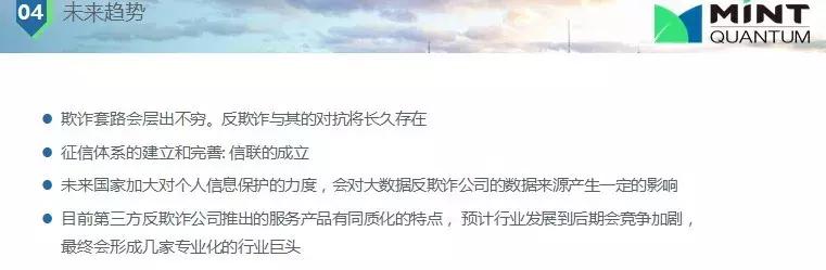 對未來一點展望,欺詐永遠不會停止、不會消失,尤其在中國征信沒有完全建立,人口多,社會缺乏金融知識,對征信了解很少,收入差距比較大的環(huán)境下,欺詐現(xiàn)象會長期存在,這在風控里面是考慮的一個重要部分。征信體系的建立和完善,雖然這個過程會很長;目前第三方反欺詐公司推出的服務(wù)產(chǎn)品有同質(zhì)化的特點,預(yù)計行業(yè)發(fā)展到后期會競爭加劇,最終會形成幾家專業(yè)化的行業(yè)巨頭。
